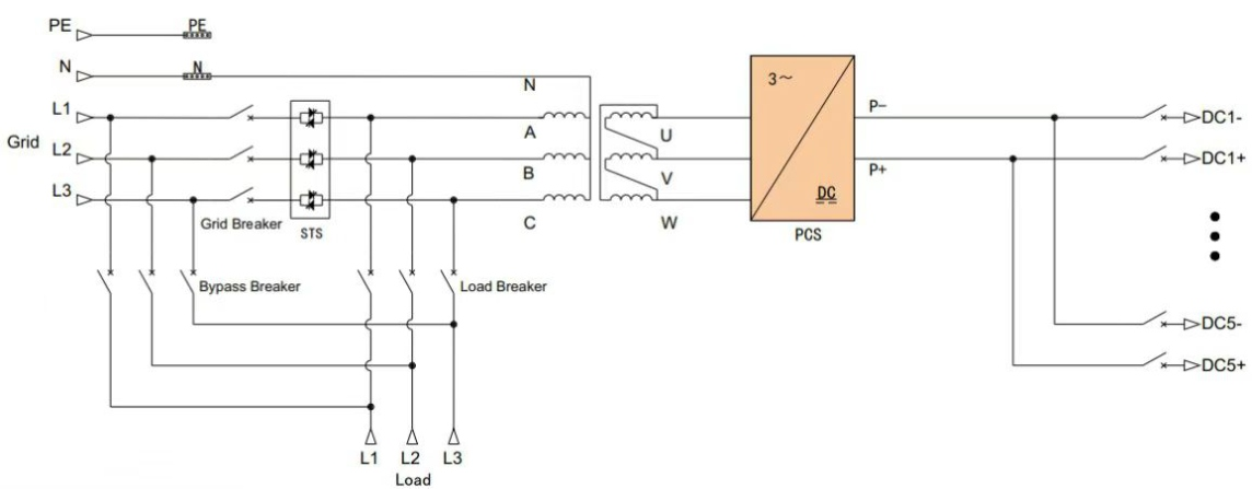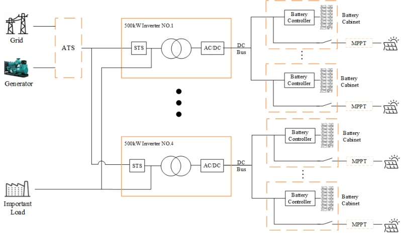 1. Cargas superiores a 500 kW, recomenda-se o uso de um inversor de armazenamento de energia de unidade única de 500 kW de grande capacidade, que é capaz de suportar até quatro conjuntos de conexões paralelas, alcançando uma potência total de 2 MW;