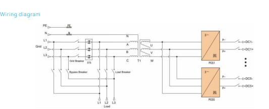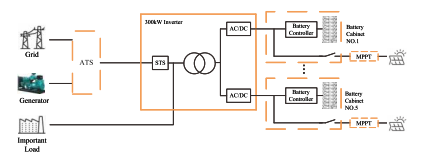 Recurso O sistema utiliza unidades inversoras modulares em configuração paralela, onde a entrada DC de cada módulo inversor corresponde a um gabinete de bateria dedicado, permitindo o gerenciamento por cluster para eliminar correntes circulantes entre cordas de bateria. Os módulos de energia CA/CC suportam implantação flexível em quantidade e classificação de potência, com capacidade máxima de módulos de 60kW em um paralelo de 5 unidades configuração. A saída CA dos módulos de potência é fornecida através de um transformador estágio de saída isolado, fornecendo energia para a carga com forte resistência a choque atual. O ESS híbrido emprega integração fotovoltaica acoplada em CC, alcançando alta eficiência de conversão de energia e otimizado para cenários fora da rede com energia fotovoltaica capacidade de geração superior à demanda de carga; Controladores MPPT para uso externo integre funcionalidades de combinador e MPPT em um único gabinete reforçado. O sistema completo inclui uma opção de gerador a diesel ATS, um híbrido de 300kW inversor, controlador fotovoltaico MPPT e um sistema de armazenamento de energia da bateria.